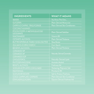 Water, Glycerin, Caprylic/Capric Triglyceride, Coconut Alkanes, Polyglyceryl-3 Methylglucose Distearate, Niacinamide, Cetearyl Alcohol, Butyrospermum Parkii (Shea) Butter, Zea Mays (Corn) Starch, Behenyl Alcohol, Ceramide Np, Ceramide Ap, Ceramide Eop, Cholesterol, Phytosphingosine, Benzyl Alcohol, Sodium Acrylates Copolymer, Panthenol, Sodium Benzoate, Coco-Caprylate/Caprate, Ethylhexylglycerin.