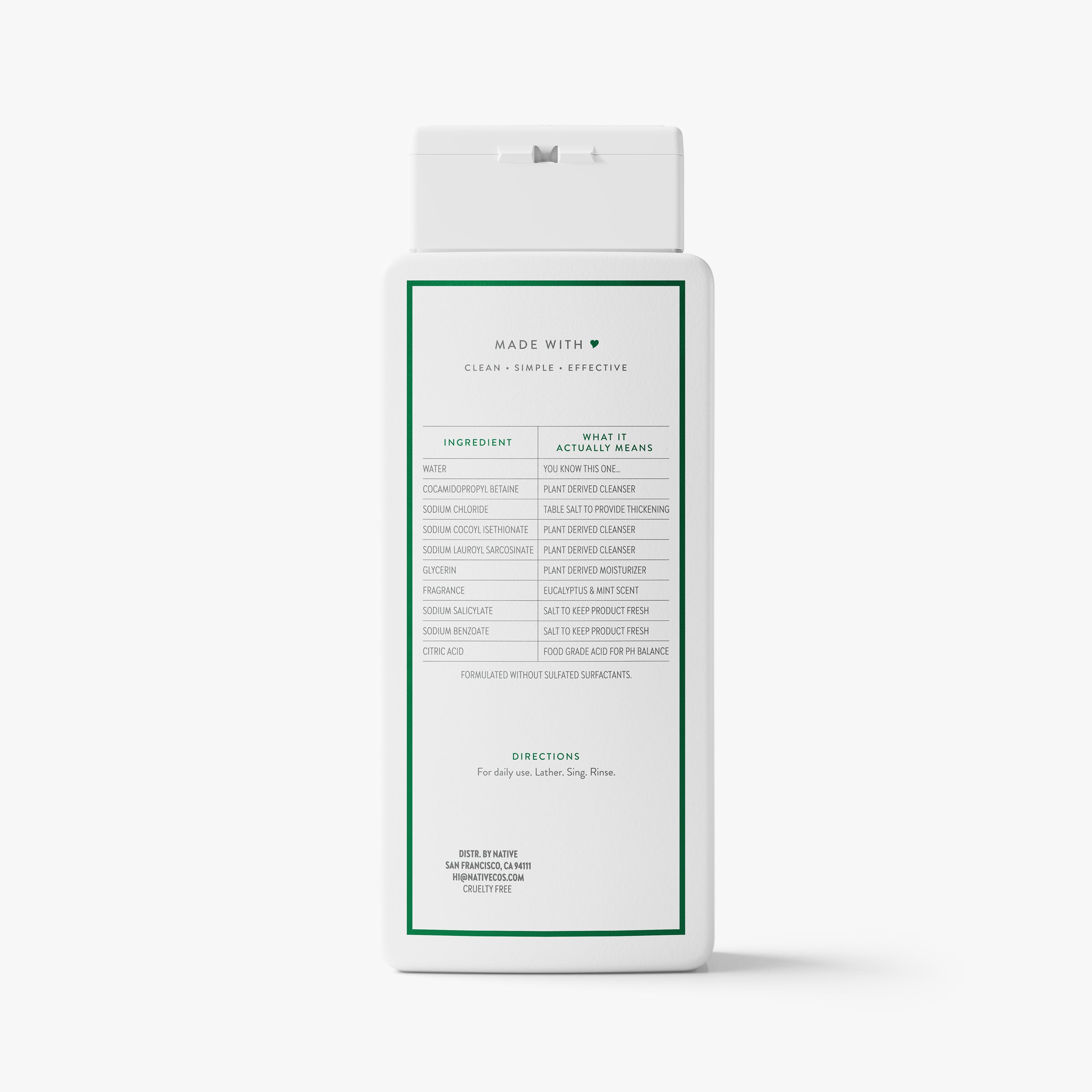 Water, Cocamidopropyl Betaine, Sodium Chloride, Sodium Cocoyl Isethionate, Sodium Lauroyl Sarcosinate, Glycerin, Fragrance, Sodium Salicylate, Sodium Benzoate, Citric Acid.