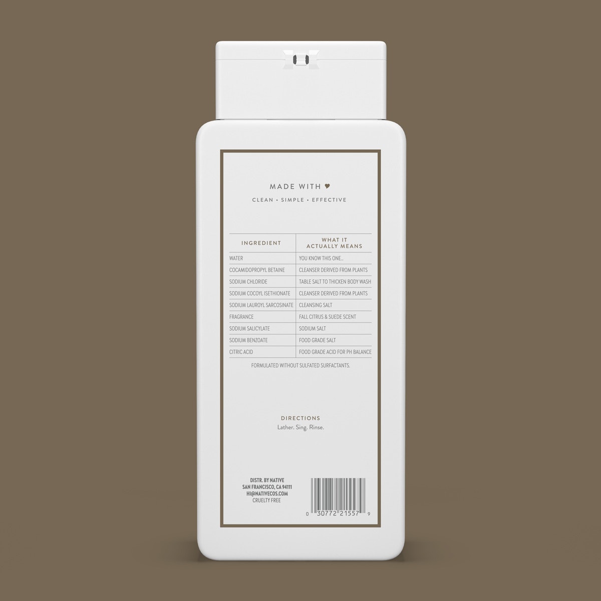 Water, Cocamidopropyl Betaine, Sodium Chloride, Sodium Cocoyl Isethionate, Sodium Lauroyl Sarcosinate, Glycerin, Fragrance, Sodium Salicylate, Sodium Benzoate, Citric Acid.