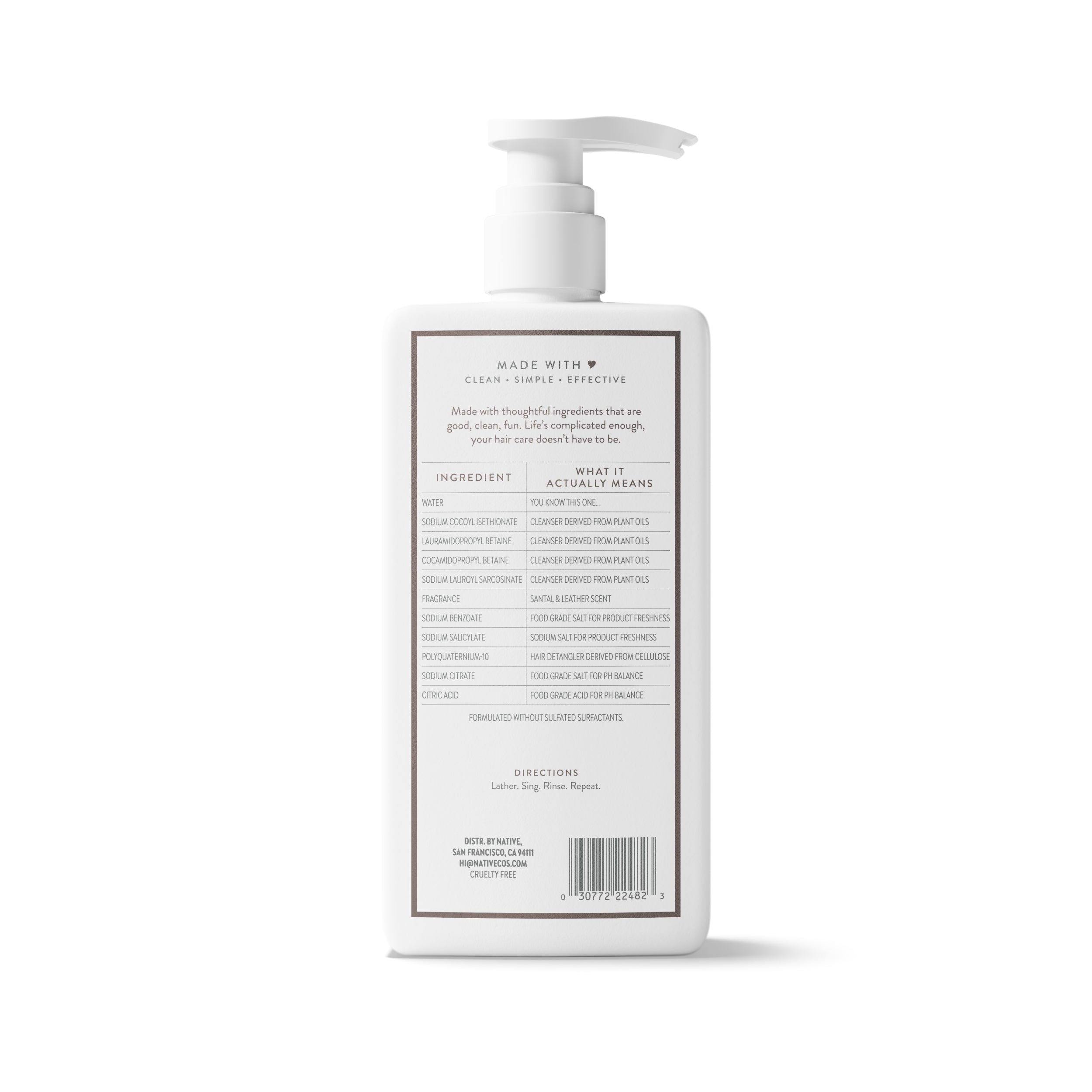 Water, Sodium Cocoyl Isethionate, Lauramidopropyl Betaine, Cocamidopropyl Betaine, Sodium Lauroyl Sarcosinate, Fragrance, Sodium Benzoate, Sodium Salicylate, Polyquaternium-10, Sodium Citrate, Citric Acid.