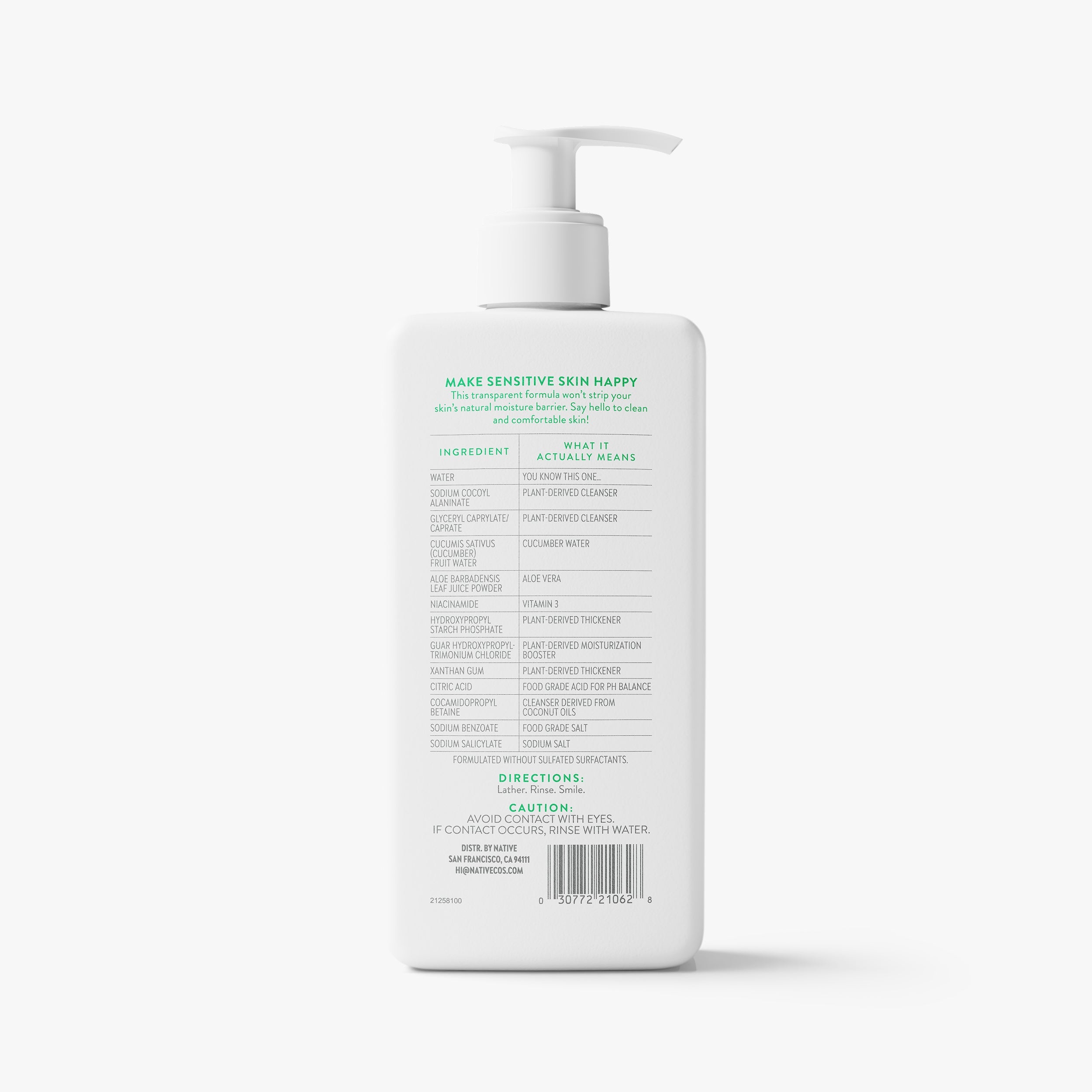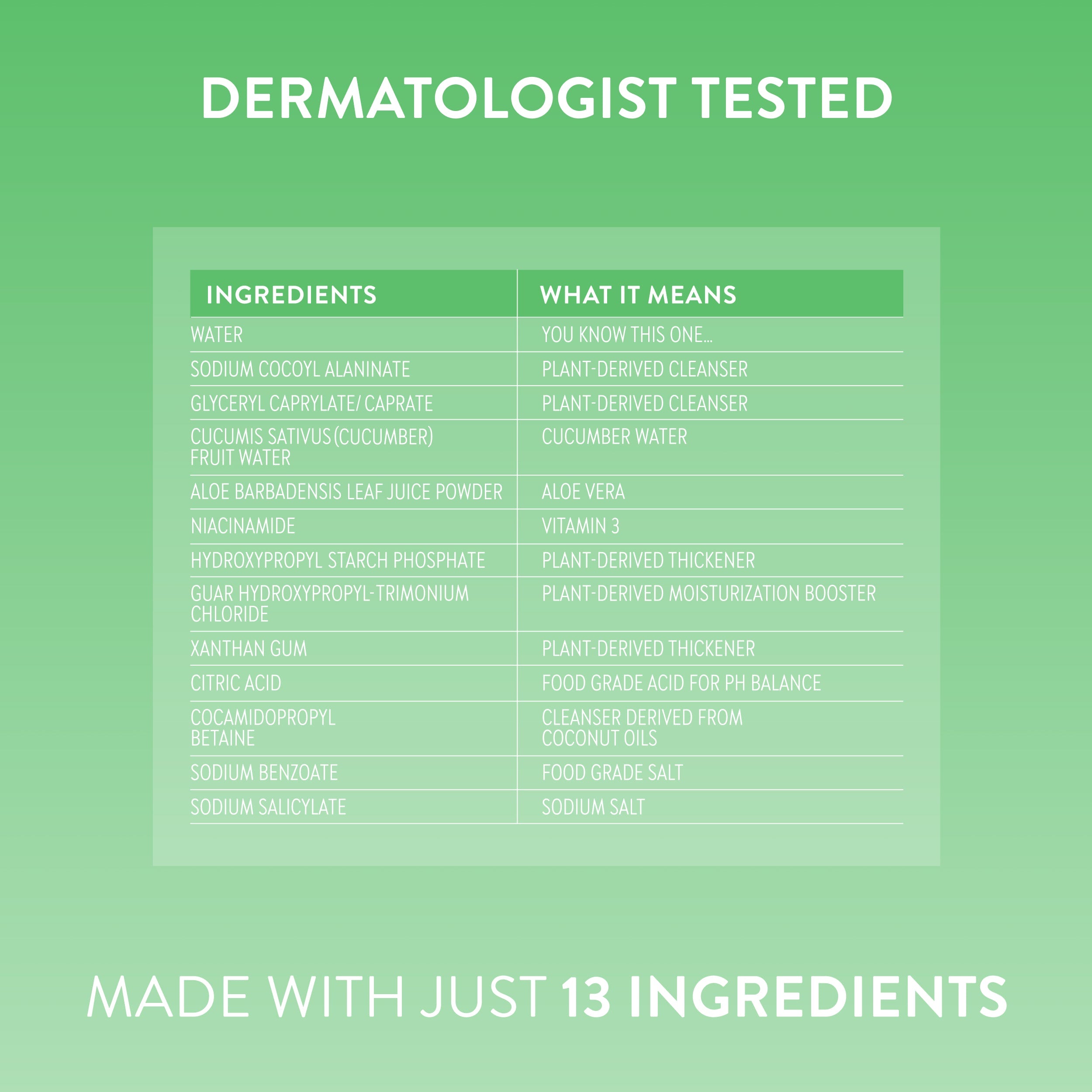 Water, Sodium Cocoyl Alaninate, Glyceryl Caprylate/Caprate, Cucumis Sativus (Cucumber) Fruit Water, Aloe Barbadensis Leaf Juice Powder, Niacinamide, Hydroxypropyl Starch Phosphate, Guar Hydroxypropyltrimonium Chloride, Xanthan Gum, Citric Acid, Cocamidopropyl Betaine, Sodium Benzoate, Sodium Salicylate.