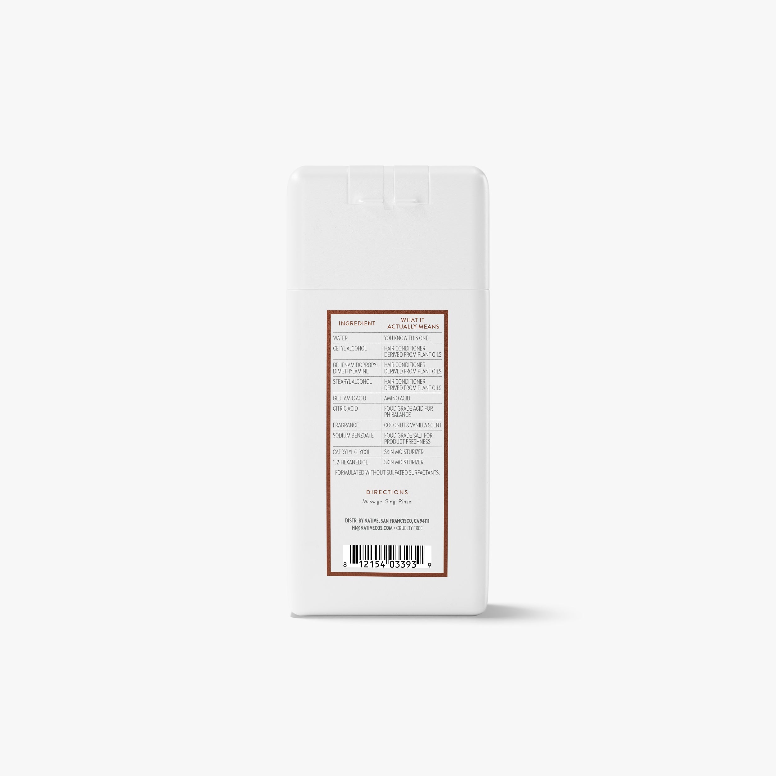 Water, Cetyl Alcohol, Behenamidopropyl Dimethylamine, Stearyl Alcohol, Glutamic Acid, Citric Acid, Fragrance, Sodium Benzoate, Caprylyl Glycol, 1, 2-Hexanediol.
